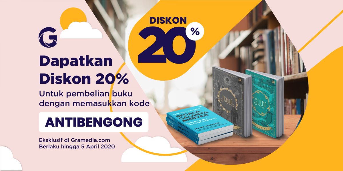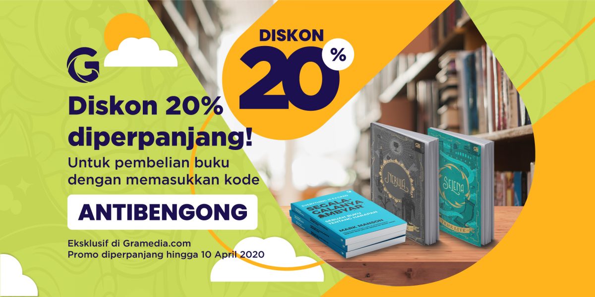 Promo #ANTIBENGONG berupa diskon 20% untuk semua buku diperpanjang hingga 10 April 2020. Dari komik, novel, hingga buku resep masakan, semua ada!