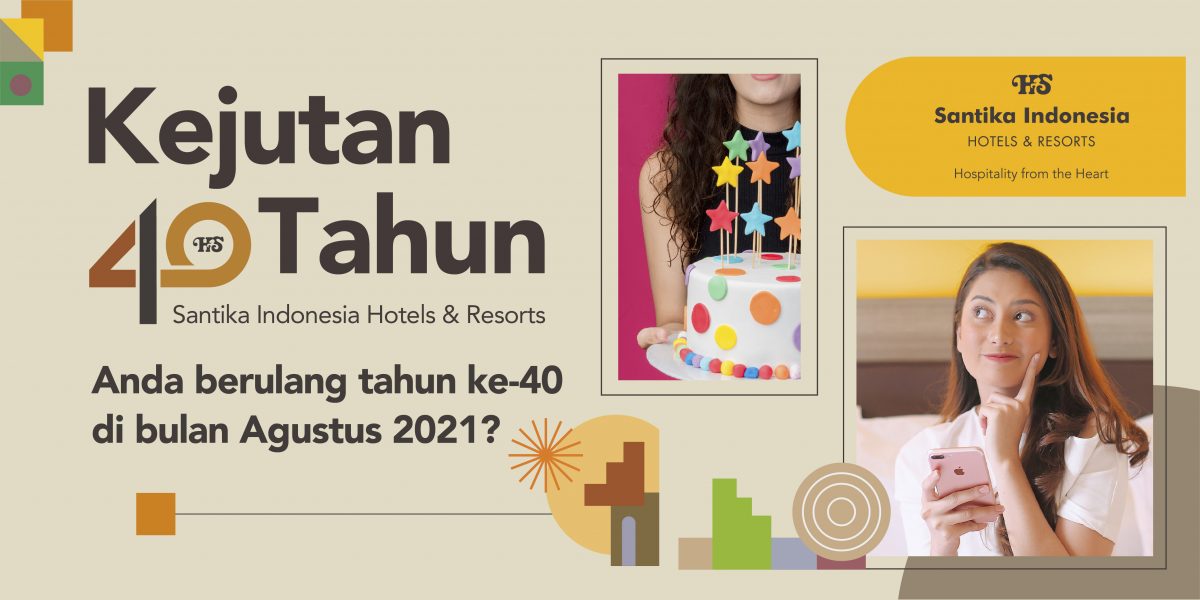 Memasuki bulan Agustus, Santika Indonesia Hotels & Resorts akan segera merayakan hari jadinya yang ke-40 di tanggal 22 Agustus 2021. Mengambil momen yang membahagiakan ini, Santika Indonesia ingin mengucapkan rasa terima kasihnya kepada seluruh tamu setianya dengan memberikan banyak hadiah gratis.